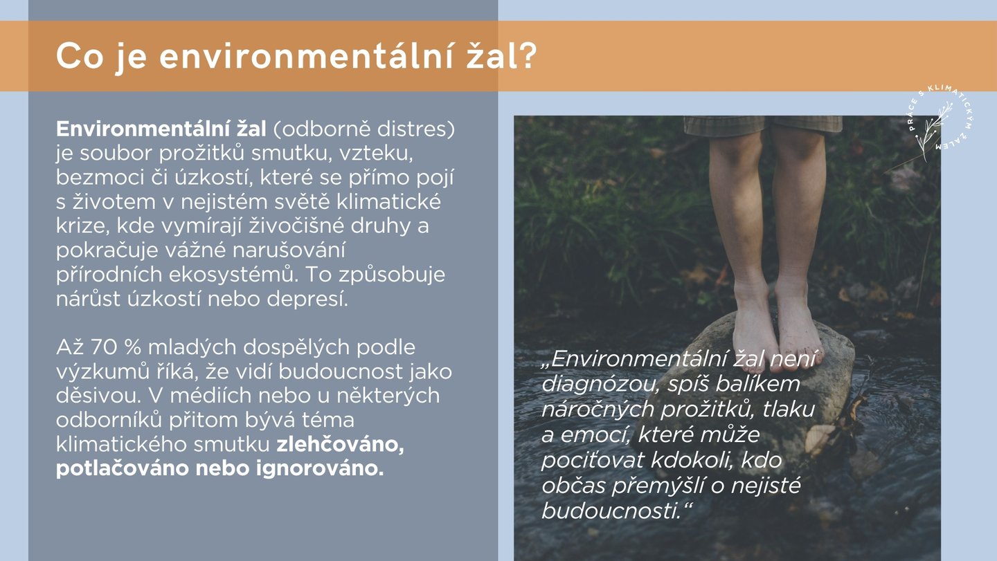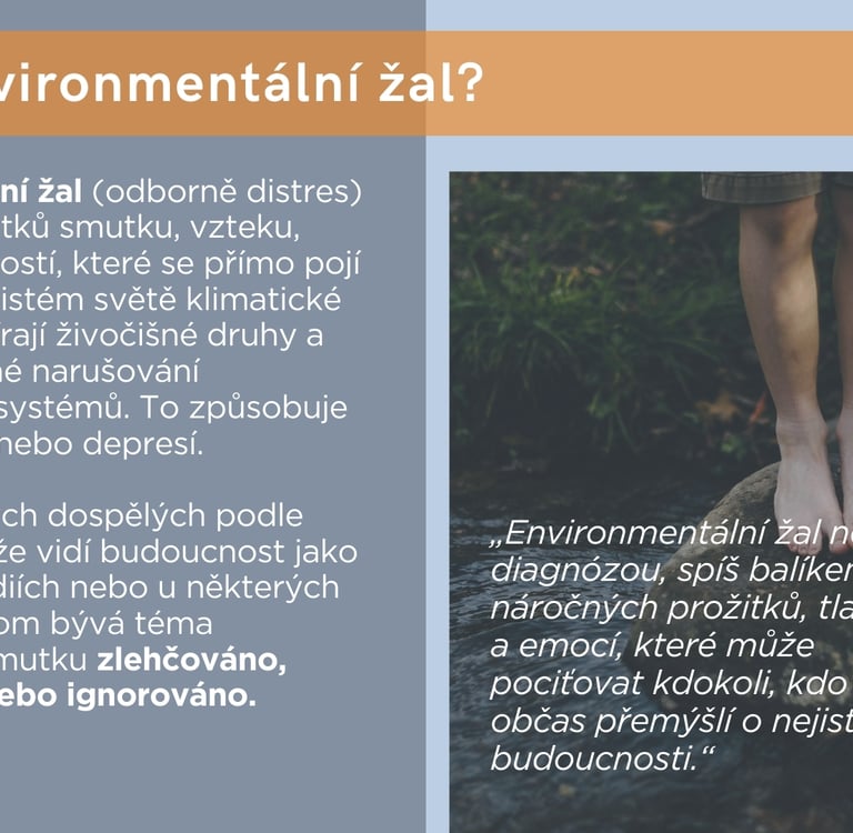 ● V médiích nebo mimo naše sociální bubliny přitom bývá téma environmentálního distresu / žalu zlehčováno, potlačováno nebo ignorováno a individuální psychoterapeutická péče o duševní zdraví bývá akutně často nedostupná.